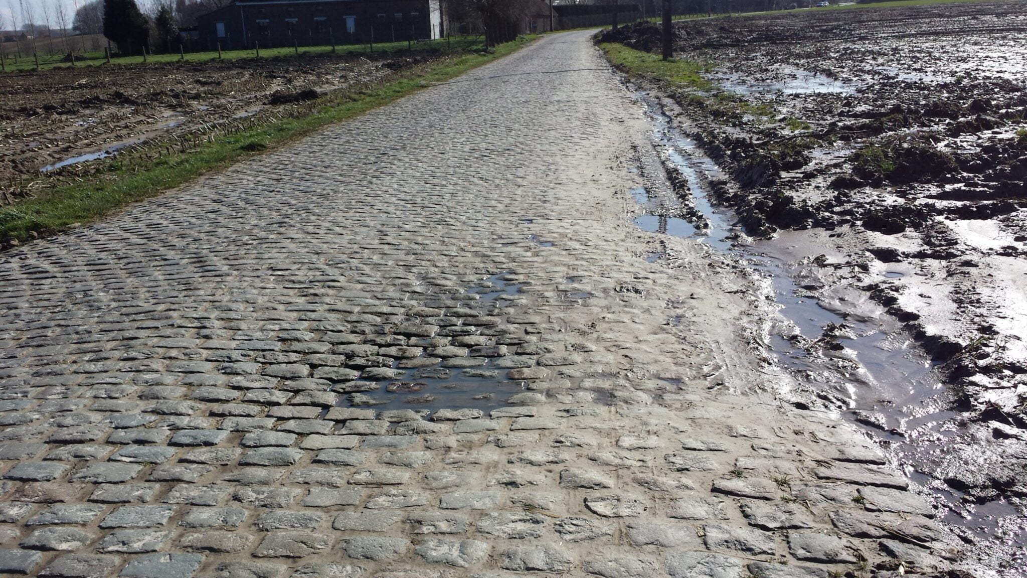 De daaropvolgende Paterberg had een mooi gootje ernaast om de keien te vermijden – lastig vanwege de modder, maar minder inspannend. Hierna ging het naar en over de Koppenberg en die was zo glibberig, dat ik viel toen mijn achterwiel wegslipte.